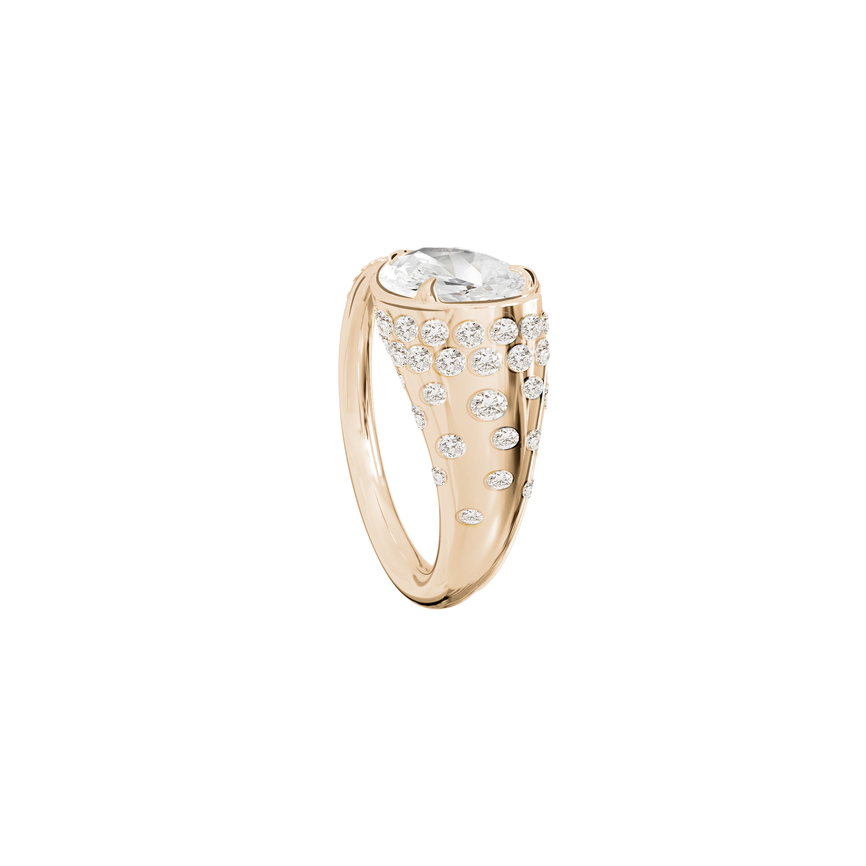 La bague Sornette est ornée d’un diamant créé en laboratoire, taille poire de 2ct, et se pare de pois diamantés. Cinq diamants terminent sa queue et contrastent avec la rondeur des courbes de l’or rose. A porter seule ou en accumulation.