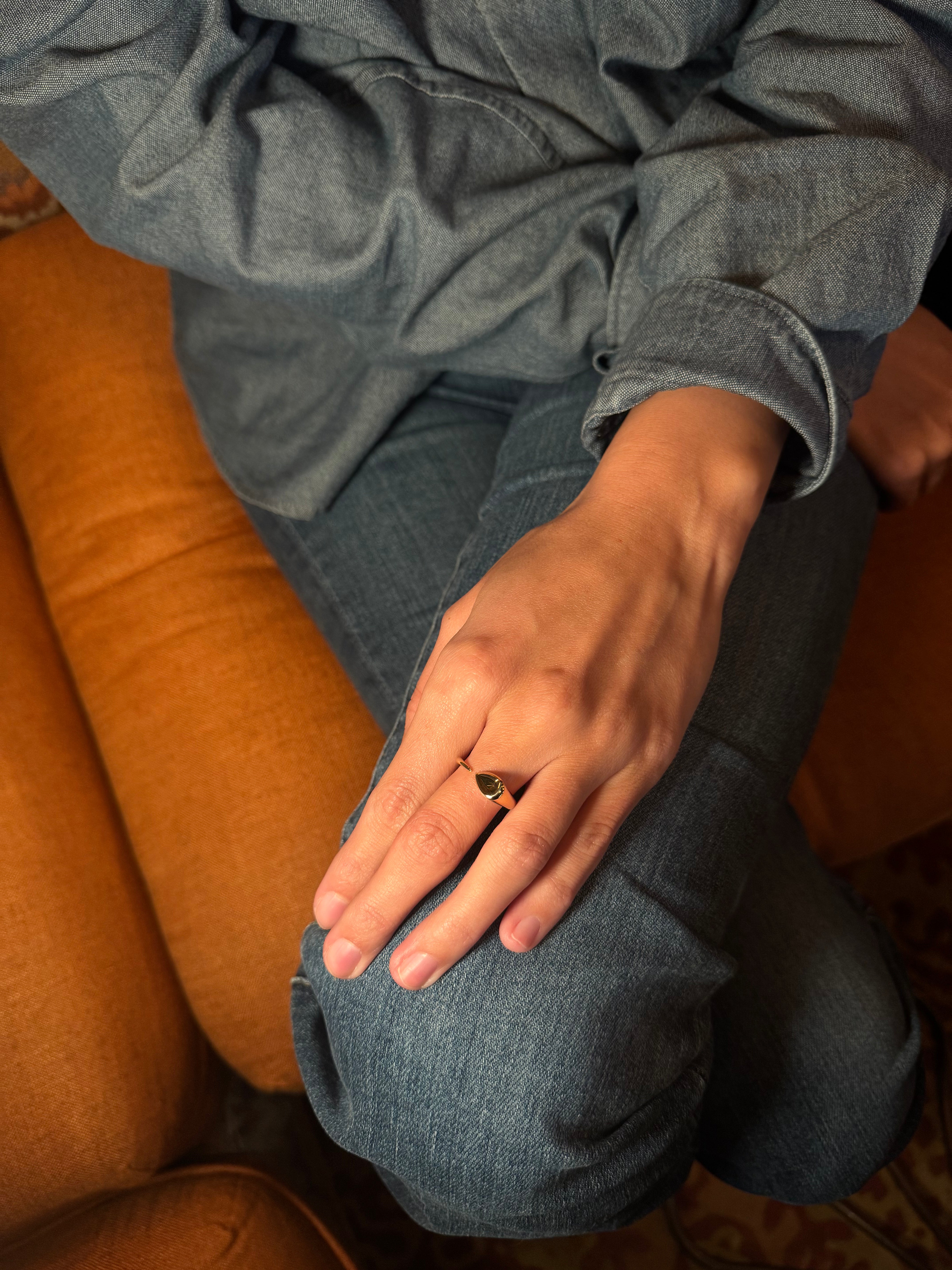The Sornette ring, model Classic, reveals the purity of its curves in full yellow gold. With sculptural lines that play with roundness and light, it embodies timeless elegance. Its center mirrors the proportions of a 0.75 ct pear-shaped diamond, making it perfect to wear alone or paired with the diamond-set model.